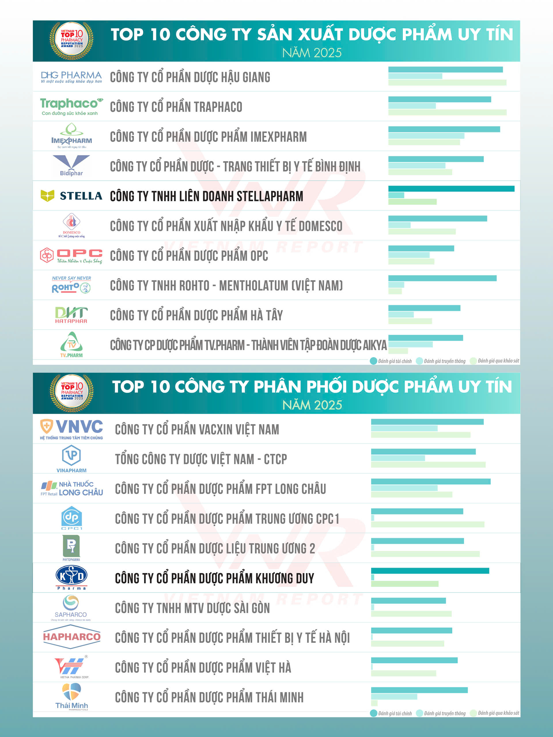 Trong bảng xếp hạng năm nay, Công ty TNHH Liên doanh STELLAPHARM vinh dự đạt Top 10 Công ty Sản xuất Dược phẩm uy tín năm 2025. Đồng thời, Công ty Cổ phần Dược phẩm Khương Duy cũng được vinh danh trong Top 10 Công ty Phân phối Dược phẩm uy tín năm 2025.
